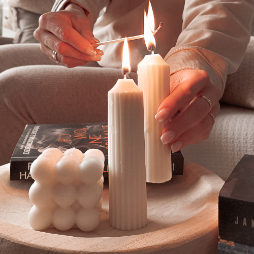 Biała świeca dekoracyjna Esoy w kształcie kostki może stać się unikatową dekoracją, której blask każdego dnia będzie koić nasze zmysły, otulając nas swoim ciepłem.